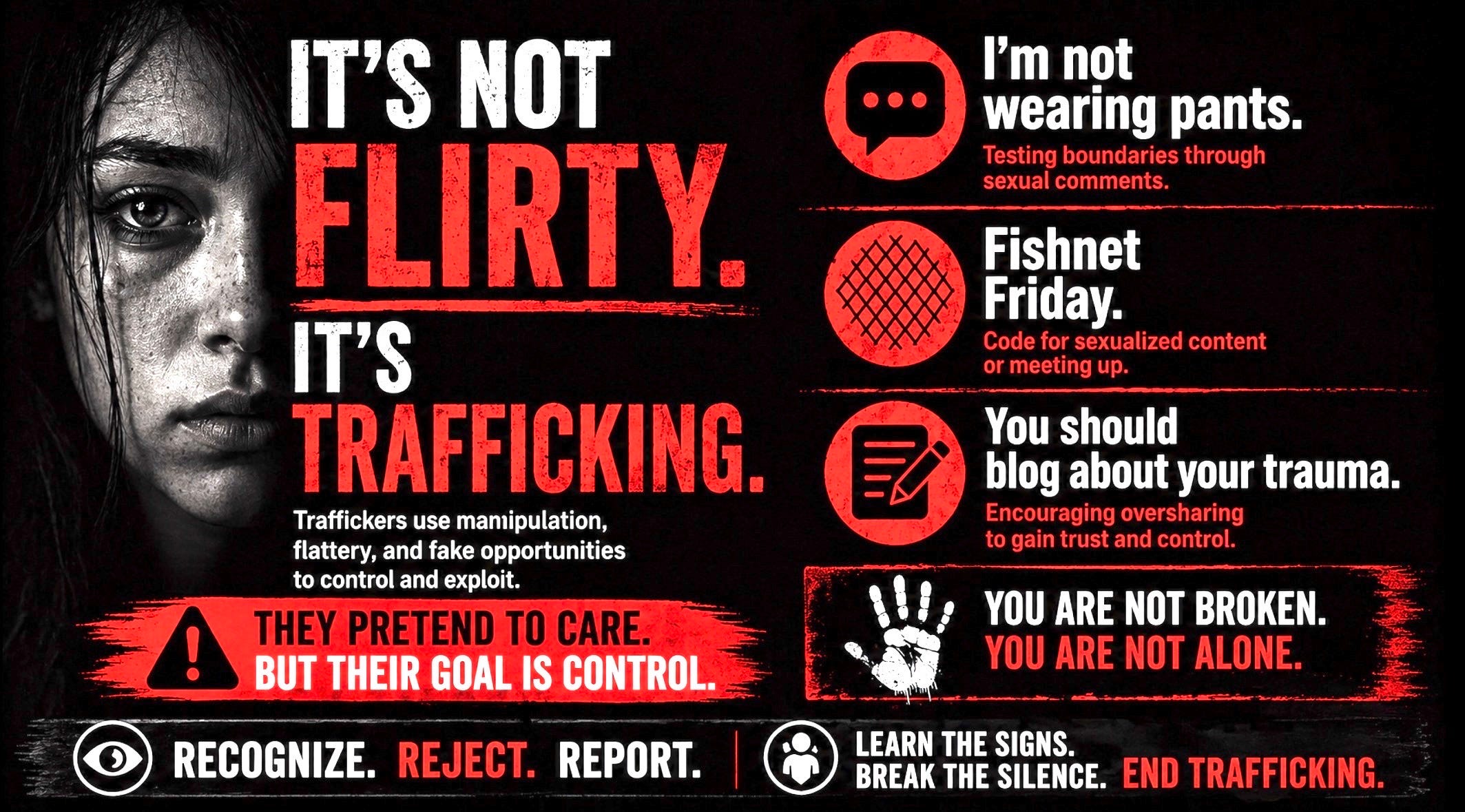 If someone within the same circle says, hints or suggests that they’re not wearing pants, this may be a trafficking ring code/call to action and/or grooming technique. They will also hint at knowing specific details about your private life, such as sexual activities with your partner, which is exploitation of private data.